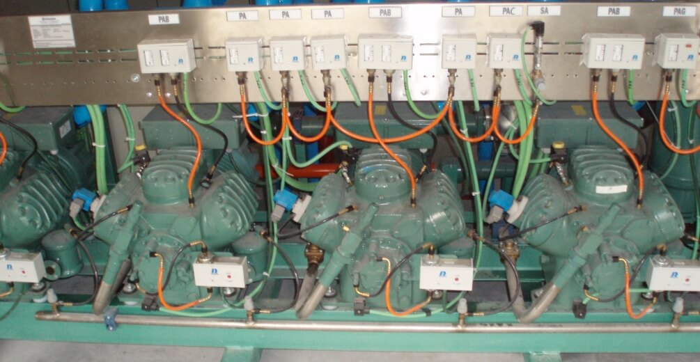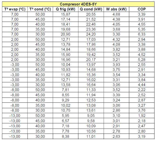 Tabla con los datos de trabajo del compresor en diferentes condiciones para cámara de refrigeración o cuarto frío